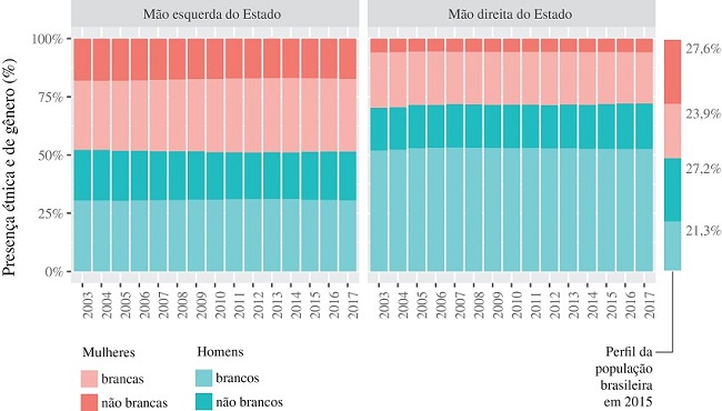 Além disso, as carreiras da mão direita do Estado são compostas majoritariamente por homens brancos, um padrão de desigualdade que se torna ainda mais intenso quando observada a ocupação de cargos de confiança de alto escalão.