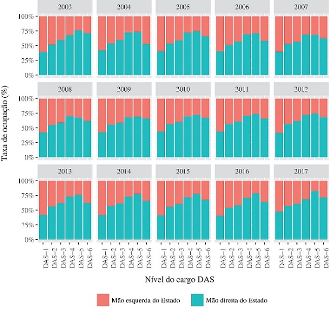 O Gráfico 4 revela um padrão quase constante ao longo do período analisado. Quanto maior o nível hierárquico do cargo em confiança, menor é a presença de membros de carreiras da mão esquerda do Estado. A tendência só não é seguida nos cargos DAS-6, que apresentam presença de membros dessas carreiras um pouco maior que nos cargos DAS-5, mas ainda assim muito longe de uma proporção equilibrada com as carreiras da mão direita do Estado, que em 2017 ocupam cerca de 75% dos cargos DAS-6 e cerca de 80% dos cargos DAS-5.