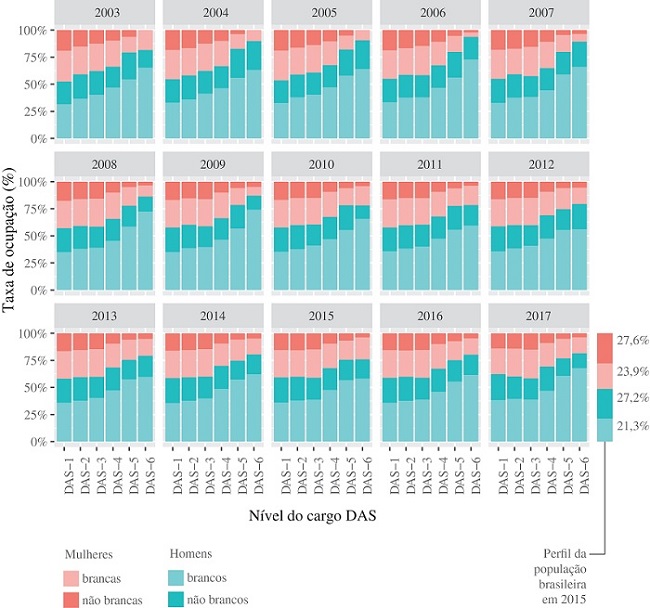 O Gráfico 5 mostra que, quanto maior o nível de DAS, menor é a população feminina e não branca. Em todos os níveis de DAS a presença dos homens é maior que a sua participação na população brasileira. Nos níveis mais altos, sua presença chega a 80%. Em alguns anos, simplesmente não há mulheres não brancas ocupando cargos DAS-6.