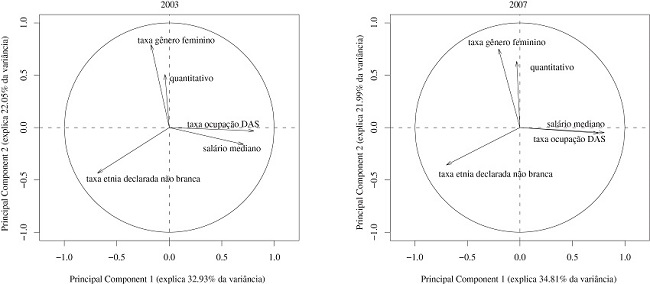 Além de tudo isso, é notório que as relações entre as variáveis não mudaram muito entre os anos pesquisados. Os vetores apontam em direções semelhantes tanto em 2003 quanto em 2017.