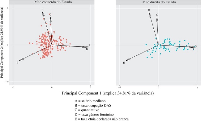Methods: The Principal Components Analysis (PCA) method was used in a career’s database built from data extracted from the Integrated System of Human Resources Administration (Siape). Results: Results show that careers associated with the bourdieusian notion of the right hand of the State are more valued and more restricted, such as economics, management, finance and control, and those associated with the left hand of the State are less valued and less restricted, such as health, education and social assistance;