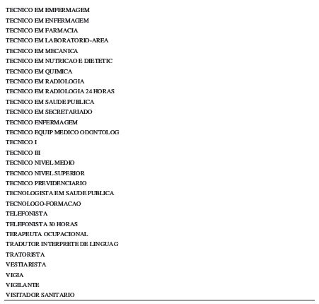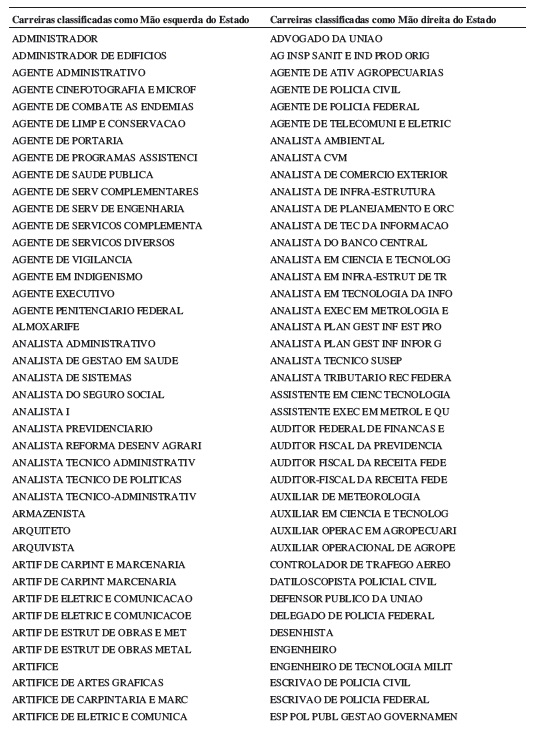 No âmbito deste trabalho, uma lista completa das carreiras classificadas em cada segmento está disponibilizada no Quadro 1, no apêndice do artigo. A mão esquerda do Estado inclui professores, médicos, funcionários da previdência, agentes de saúde, assistentes sociais, agentes penitenciários, fiscais sanitários e agropecuários, auditores do trabalho, funcionários de agências reguladoras e pessoal de apoio administrativo. Já a mão direita do Estado inclui carreiras de finanças, de orçamento, de gestão, de infraestrutura, de tecnologistas, de cobrança de tributos, de controle de contas, de procuradoria pública e de policiamento.