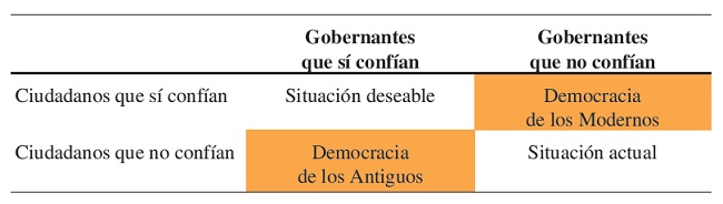 En tercer lugar, moviéndonos hacia un cuadrante que no aparece en la Cuadro 1, podríamos imaginar una situación que combine la confianza en los ciudadanos con la confianza en los gobernantes. Una situación de doble confianza que, a nuestro entender, sería crucial para ofrecer una adecuada respuesta a los retos colectivos de este nuevo milenio. Una situación donde el ciudadano recuperaría el papel que le había otorgado la democracia de los antiguos sin renunciar al rol de los gobernantes en contextos de mayor dimensión demográfica y complejidad social (Fiskin 2011).