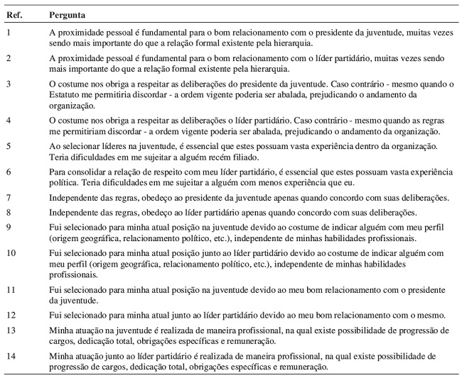 O conteúdo das 24 perguntas foi parametrizado teoricamente por tipos ideais dicotômicos. Consideraram-se (1) os paradigmas weberianos patrimonial e burocrático, a fim de entender a relação entre os líderes e seus subordinados (Weber 2009) e (2) as orientações gerencial e societal, para perceber mecanismos de gestão e democracia interna (Oliveira 2013).