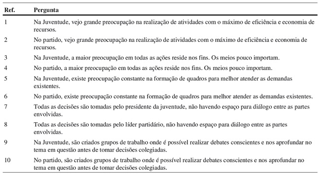 Cada uma das perguntas foi elaborada com base no referencial teórico, buscando-se versões simplificadas para evitar ambiguidades e aumentar a clareza (Likert 1932, p.12). Ainda, as perguntas foram realizadas de forma a se perceber sempre um “julgamento de valores” e não um “julgamento de fatos”4 (Likert 1932, p.12), uma vez que a percepção dos jovens é o objeto deste estudo, contextualizado pela motivação ao engajamento em organizações partidárias juvenis.