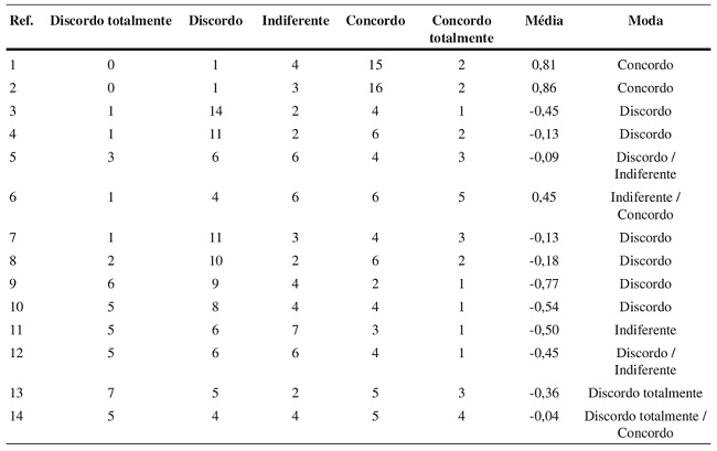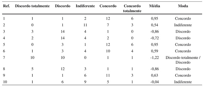 Foram apresentadas 24 afirmativas para os entrevistados. Os respondentes foram indagados sobre a concordância com cada uma delas, podendo optar por “discordo totalmente”, “discordo”, “indiferente”, “concordo” e “concordo totalmente”3 (Likert 1932, p.14). Para a análise dos resultados, uma relação matemática será utilizada, na qual os resultados serão identificados, respectivamente, pelos valores “-2”, “-1”, “0”, “1” e “2”, sendo percebidos, ao final, por sua moda e média. Assim, enquanto a moda apresenta a tendência a ser seguida, a média verifica o peso geral do comportamento.