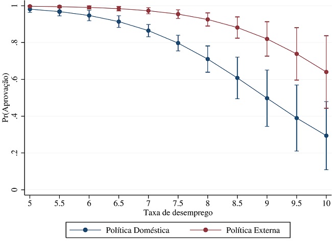 Como indica o Gráfico 1, nos casos em que a taxa de desemprego apresentou o valor mais baixo na série histórica (5%), observa-se uma alta probabilidade de sucesso legislativo em ambas as temáticas. Com o desemprego baixo, os intervalos de confiança se cruzam entre política externa e política doméstica, ambas com probabilidade de aprovação próxima de 100%. Avançando-se a taxas mais altas de desemprego, as diferenças se mostram mais evidentes e as propostas cujo tema é política internacional têm mais chances de ser aprovadas do que as de política doméstica. Deve-se ressaltar que o intervalo de confiança também cresce proporcionalmente. No cenário próximo da maior taxa de desemprego na série histórica (10%), as diferenças entre a aprovação do presidente em cada tema não chegam a ser estatisticamente significativas.