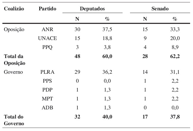 Como podemos observar na Tabela 1, a coalizão de partidos do presidente dependia principalmente da sua aliança com o PLRA para obter apoio político no parlamento. Ainda assim, o governo Lugo foi um governo minoritário, já que os partidos que declararam oposição ao ex-bispo (ANR, UNACE e PPQ) somavam 60% das cadeiras na Câmara e 62% no Senado.