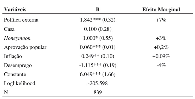 Os resultados relativos ao sucesso legislativo do presidente são reportados na Tabela 3. O modelo logístico empregado faz um bom trabalho em prever o sucesso legislativo do presidente paraguaio, fato que pôde ser comprovado por meio do teste de Wald2. O primeiro aspecto a ser observado é a confirmação da hipótese 1. Os temas de política externa têm um impacto positivo e estatisticamente significativo. O presidente tem 7% mais chance de ter uma matéria de política externa aprovada, quando comparada a uma matéria de política doméstica, mantendo-se constantes, em média, as demais variáveis do modelo.