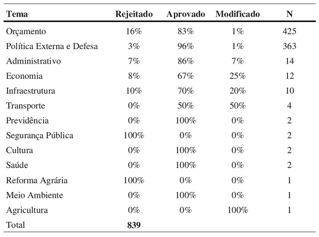 Discussion: The proof of the thesis of the two presidents in a multiparty presidentialism with a low institutional propensity to the predomination of the president in the legislative process demonstrates the specificity of foreign policy when compared to domestic politics.