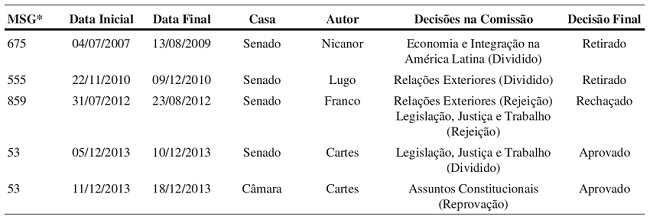 Uma breve análise do ingresso da Venezuela no Mercosul auxilia a compreender melhor a relação entre o parlamento e o presidente no Paraguai. O caso evidencia a antecipação presidencial da preferência do legislador mediano e a relação entre as facções dos principais partidos políticos e o Poder Executivo. Em 2006, o presidente Nicanor Duarte Frutos (ANR), em conjunto com seus pares do Mercosul, aprovou o protocolo de adesão da Venezuela como membro pleno do bloco. A ratificação do acordo nos legislativos nacionais dos países membros encontrou grande resistência no Senado paraguaio. A discussão se intensificou com a chegada de Lugo ao governo, constantemente acusado pela aproximação com o presidente venezuelano4 e cujas semelhanças ideológicas causava desconforto aos legisladores. A Tabela 5, resume as trajetórias que a medida passou para ser aprovada.