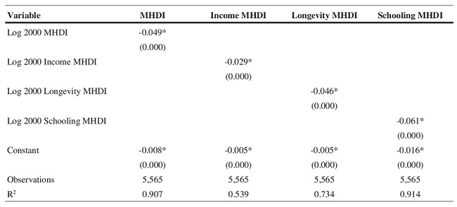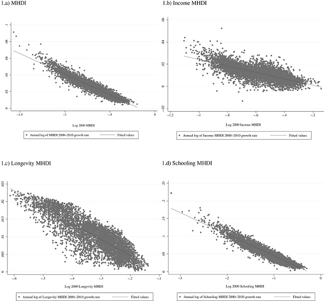 Figure 1, below, portrays scatter plots of the convergence analysis’ dependent and independent variables, as well as of the general MHDI. A negative slope is visible in each panel, pointing out that the larger the 2000 value, the smaller the expected 2000-2010 growth, all else constant.