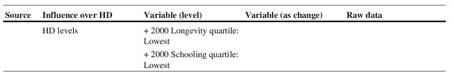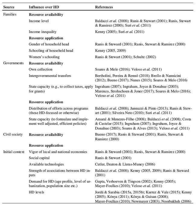 The above search for influences over HD has spread to different disciplines (Economics, Political Science, Education, Public Health), encompassing a great variety of references and causal claims. To organise the stated arguments and assist modelling, Chart 1 presents an inventory of such influences. Given the plethora of factors interfering with one’s health and schooling, not to mention the interactions between such factors, this list is not exhaustive; on the contrary, it aims to register only the main associations explored by the reviewed literature.