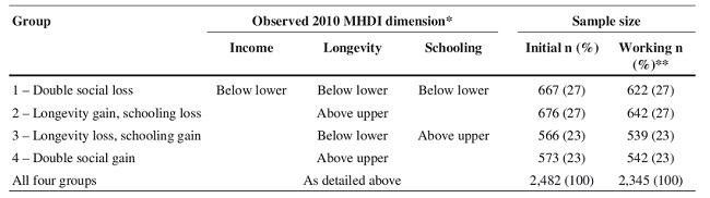 Group 1 congregates cases where all three dimensions grew less than foreseen and are nicknamed double social loss group. Group 4, on the other extreme, is the double social gain one. Groups 2 and 3 combine some social gain with some social loss. Because no arbitrary judgment regarding the relative values of longevity and schooling are made, it is not possible to order the four groups based on their desirability, although 1 and 4 are the least and most favourable clusters.