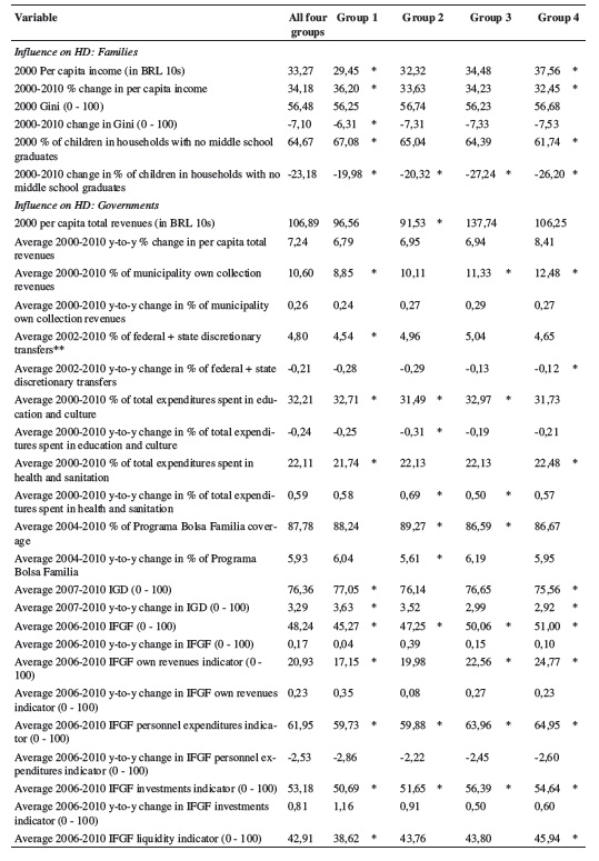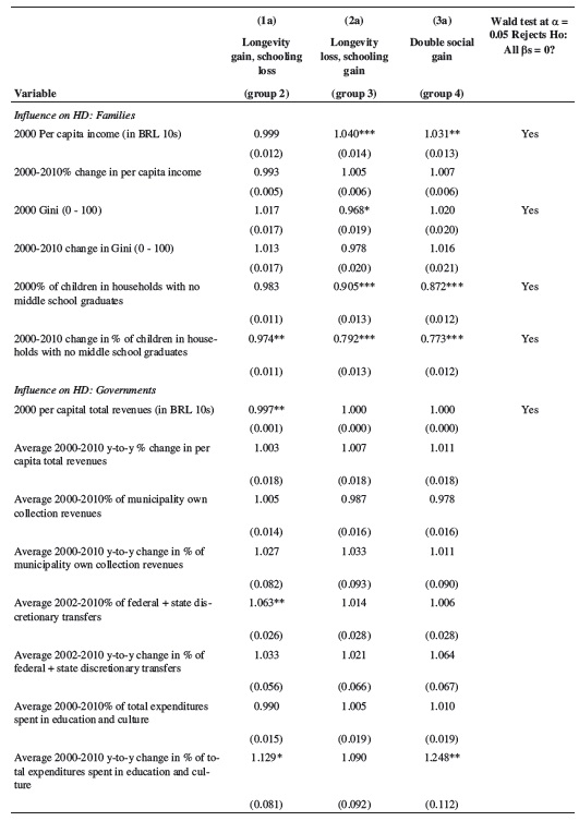 Materials and Methods: This study explores the sociodemographic and budgetary traits of Brazilian municipalities that experienced less-than-expected growth in the Municipal Human Development Index (MHDI)’s income dimension, nonetheless advanced more than expected on schooling and longevity. Municipalities whose mean per capita income advanced less than foreseen were grouped according to growth in MHDI’s social dimensions. Chances of falling into a given group were estimated through a multinomial logit model.