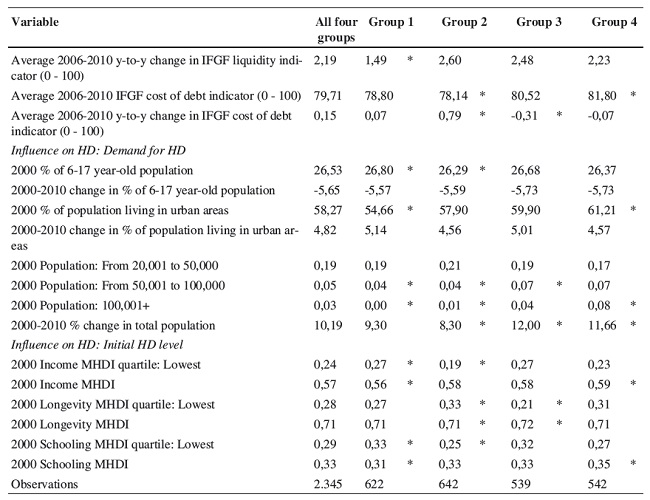 The “change” Gini variable depicts (in Table 2) a scenario of decreasing per capita household income inequality over the 2000s. Noteworthy, per cent of children in households with no middle school graduates fell 20 per cent points or more in all four groups. Budgetary indicators tended to change little from one year to the next, except for the per capita total revenues, which grew on average 7.24 per cent each year, net of inflation.19 Per cent of own collection revenue and per cent spent in health and sanitation increased by 0.26 and 0.59 per cent point yearly, on average. On the other hand, the share of discretionary transfers and expenditures on education and culture tended to shrink: 0.21 and 0.24 per cent point a year. Initial IFGF components tended to be smaller (greater) in group 1 (group 4) than in the other groups.