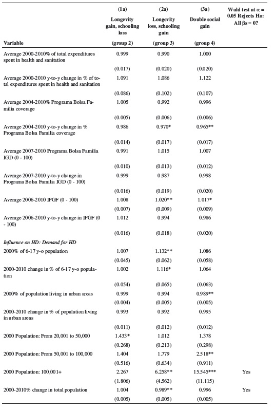 Each ten-real raise in 2000 per capita income associated with a 3.1 per cent higher RRR for the double social gain group. Each one per cent point increase in the share of children in households with no middle school graduates seems to decrease double social gain RRR by 12.8 per cent. Only five municipalities (three in Minas Gerais and two in Mato Grosso) increased this indicator during the 2000s.