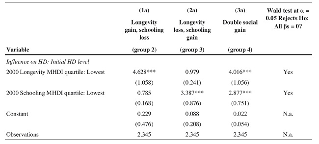 Aligned with the convergence pattern captured when groups were formed, initial schooling and longevity levels show a negative association with social gains. Being in the lowest 2000 longevity (schooling) quartile inflates by about three (two) times the probability of double social gains.