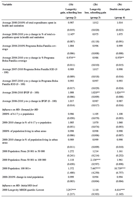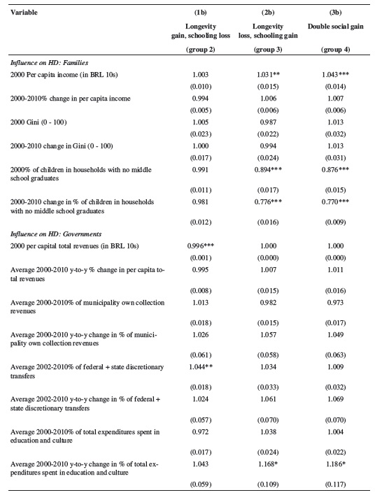 Materials and Methods: This study explores the sociodemographic and budgetary traits of Brazilian municipalities that experienced less-than-expected growth in the Municipal Human Development Index (MHDI)’s income dimension, nonetheless advanced more than expected on schooling and longevity. Municipalities whose mean per capita income advanced less than foreseen were grouped according to growth in MHDI’s social dimensions. Chances of falling into a given group were estimated through a multinomial logit model.