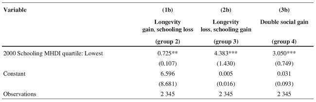 Aligned with the convergence pattern captured when groups were formed, initial schooling and longevity levels show a negative association with social gains. Being in the lowest 2000 longevity (schooling) quartile inflates by about three (two) times the probability of double social gains.