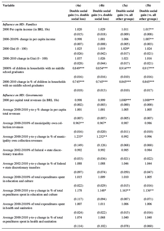 Each ten-real raise in 2000 per capita income associated with a 3.1 per cent higher RRR for the double social gain group. Each one per cent point increase in the share of children in households with no middle school graduates seems to decrease double social gain RRR by 12.8 per cent. Only five municipalities (three in Minas Gerais and two in Mato Grosso) increased this indicator during the 2000s.