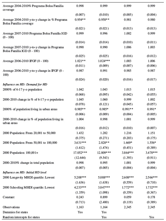 In the working sample, age profile seems to have grown older in the 2000s, with a 5.65 per cent point average decline in the per cent of the 6-17-year-old population over the decade. Urbanisation advanced 4.82 per cent points in ten years, on average, while the total population increased 10.19 per cent between 2000 and 2010, on average. Initial Schooling MHDI levels in 2000 were less than half those of the longevity dimensions.