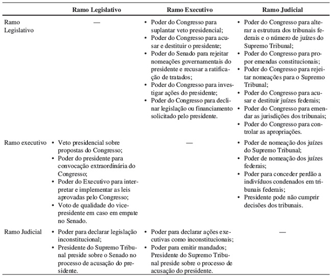 O desígnio elementar da constituição era criar os mecanismos necessários para garantir a proteção efetiva de cada ramo governamental contra a intromissão pelos outros ramos concorrentes (Madison 1987c). Por conseguinte, os fundadores introduziram um mecanismo de “vetos mútuos” que serve de inibição à tentativa de sobreposição de um ramo sobre os outros (Sundquist 2011), que estão resumidos no Quadro 1.