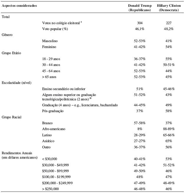 Uma explicação paralela salienta o comportamento eleitoral determinante de alguns grupos políticos específicos (Tabela 1). Vários estudos pós-eleitorais destacam o facto de alguns eleitores-chave para os Democratas – e.g., afro-americanos, hispânicos e jovens – terem uma participação inferior ao previsto e, consequentemente, contribuírem para a vitória de Trump (Luhby 2016; Scott & Kirk 2016). Os mesmos estudos demonstram que Trump conseguiu conquistar uma percentagem significativa do voto branco, 58% contra 37% de Clinton, respetivamente. Por conseguinte, embora o peso relativo do voto branco seja menor em 2016 do que no passado, Trump conseguiu superar as margens conseguidas por Reagan e Romney em 1984 e 2012, respetivamente (Brownstein 2016; Cillizza 2016). Embora Clinton tivesse conquistado outros grupos eleitorais, nomeadamente os afro-americanos (88%) e hispânicos (66%), a sua margem de vitória foi inferior à de Obama. Paralelamente, Trump conseguiu melhores resultados entre estes grupos minoritários do que o candidato Republicano nas eleições anteriores (Krogstad & Lopez 2016).
