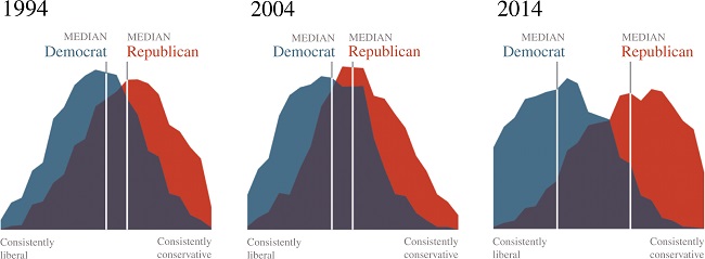 Um estudo realizado pelo Pew Research Center analisa a crescente polarização ideológica ao longo das últimas décadas. Como se pode observar no Gráfico 3, entre 1994 e 2014 o número de indivíduos que expressam posições consistentemente conservadoras ou liberais duplicou. De acordo com o mesmo estudo, atualmente, “92% dos Republicanos encontram-se à direita do Democrata médio e 94% dos Democratas encontram-se à esquerda do Republicano médio” (Pew Research Center 2014, p.6). Por outras palavras, devido à radicalização ideológica, há cada vez menos justaposição de interesses e opiniões entre Republicanos e Democratas.