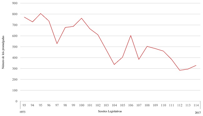 Vários estudos recentes apontam para a crescente divergência entre os dois principais partidos no Congresso (Jones 2015; Theriault 2006). Particularmente importante, Theriault demonstra que, contrariamente ao consenso tradicional, a divergência ideológica também resulta da adaptação dos legisladores. Mais concretamente, “mais de um terço da polarização na Câmara e no Senado resulta da adaptação dos membros aos polos ideológicos” (Theriault 2006, p.498). A rutura ideológica e a crescente polarização dos dois principais partidos políticos reflete-se igualmente na diminuição do número de leis promulgadas pelo Congresso ao longo da últimas décadas, como se pode constatar no Gráfico 4. O reduzido número de leis promulgadas resulta da crescente dificuldade em gerar compromissos legislativos entre os dois principais partidos. Embora haja muitos fatores a motivar a produtividade legislativa, os períodos de “governo dividido” – i.e., quando o partido da oposição controla uma ou ambas as câmaras do Congresso – são especialmente propensos à redução da aprovação de legislação (Howell et al., 2000). De forma semelhante, a polarização política verifica-se também na crescente tendência para a convergência de votos nas eleições nacionais. Enquanto na década de 1970 cerca de um quarto dos eleitores repartiam o seu voto entre os dois principais partidos nas eleições governamentais – i.e., votando em diferentes partidos para a Presidência e para o Congresso – atualmente apenas 11% repartem o seu voto (Jacobson 2016)14.