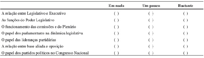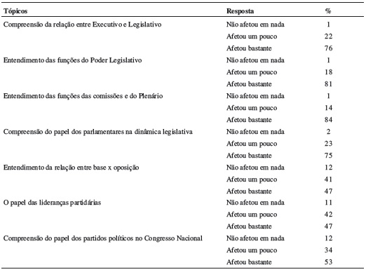 O nível de conhecimento foi associado a tópicos específicos, como a compreensão da relação entre Legislativo e Executivo, entendimento das funções do Poder Legislativo, das comissões permanentes e plenário, o papel dos parlamentares na dinâmica legislativa, o papel das lideranças partidárias, a relação da base parlamentar de apoio ao governo vs oposição, o papel das lideranças partidárias e o papel dos partidos políticos no Congresso Nacional. Em todos esses itens, o maior nível de aprendizado ficou entre 47% e 84%, como mostra a Tabela 5.