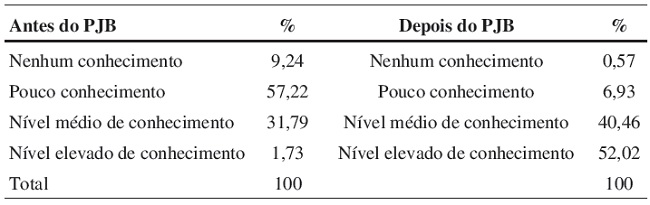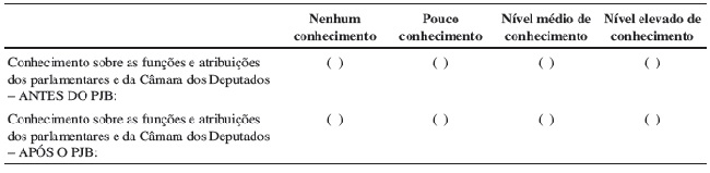 Os conhecimentos adquiridos com a experiência de simulação parlamentar são amplamente ressaltados pelos informantes. Perguntados qual o nível de conhecimento deles sobre o Poder Legislativo antes e depois do PJB, conforme se vê na Tabela 4, há uma significativa elevação em todos os itens.
