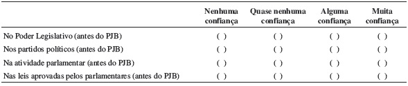 Os dados estão em consonância com as tendências indicadas pela literatura especializada. Os estudos registram um refluxo nas formas convencionais de participação política entre os jovens e um crescimento na adesão às modalidades de mobilização caracterizadas pela contestação, o protesto e o ativismo (Ribeiro 2012). A rejeição às práticas políticas estabelecidas é nitidamente rechaçada pelos movimentos protagonizados por jovens, levando-os a negar que fazem política, mesmo quando existem características tipicamente políticas, como mostra o levantamento coordenado por Mayorga, Castro e Prado (2012). Isso implica a adesão a um enquadramento interpretativo de rejeição à política partidária e às lógicas dominantes nas eleições e no cotidiano das câmaras de vereadores, assembleias legislativas, Câmara dos Deputados e no Senado Federal. O reflexo direto disso é a baixa confiança nas instituições legislativas, com registro de 4,4 numa escala de zero a 10 (Baptista et al., 2013, p.129). O que explica tal performance em termos de confiança no Poder Legislativo (em todos os níveis), segundo os autores citados, é a recorrente associação entre política e corrupção, o que reforça o pessimismo e a descrença da juventude:
