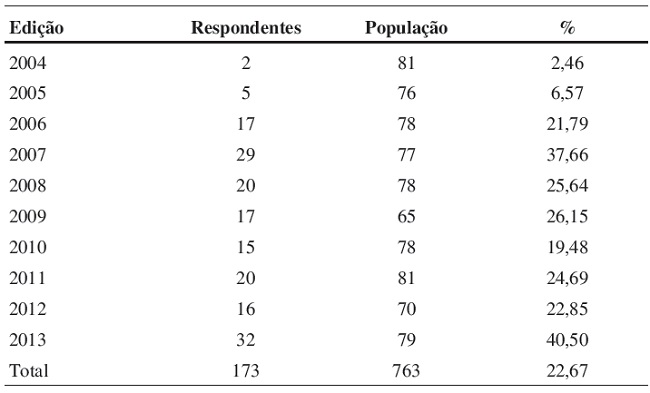 Methods: The survey was conducted in 2014 using an online questionnaire sent to 763 participants in 10 editions (2004-2013) and received 173 answers (22.67%).