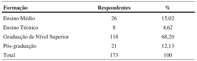 Em relação à formação educacional dos egressos, grande parte dos respondentes está em processo de graduação ou já se formaram13 (69,05%). Quando se separam apenas aqueles graduados ou graduandos em ciências humanas ou sociais aplicadas chega-se a um percentual de 47,93% do total. Na Tabela 3 são apresentados os dados do nível de formação dos egressos respondentes, considerando o nível já completo ou em curso.