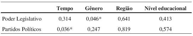 Considerando-se um intervalo de confiança de 95%, os valores de p destacados indicam que ao menos um dos grupos comparados quanto à média da variação da confiança institucional são significativamente diferentes. Quanto à confiança no Poder Legislativo, mais mulheres demonstraram variação do nível de confiança, além de indicarem também maiores níveis de crescimento na confiança. Em relação aos partidos políticos, o teste realizado não demonstra diferença significativa de variação pelo sexo dos egressos. A percepção da variação da confiança no Poder Legislativo se mantém no tempo, com pouca variação nos três grupos analisados, entretanto, a confiança nos partidos políticos decai significativamente com o tempo decorrido da participação.