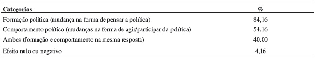 O caráter educativo, no que tange à formação política do PJB, é reconhecida por 84% dos egressos que responderam à questão aberta, conforme mostra a Tabela 7, a seguir. Do ponto de vista da influência do PJB no comportamento político, pouco mais da metade (54%) dos respondentes indicaram textualmente alguma modificação na forma de agir, ao passo que cerca de 40% dos sujeitos responderam que o PJB exerceu influência tanto na formação política quanto no comportamento cotidiano.