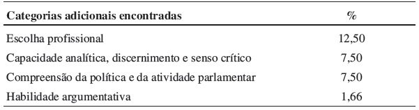 Ao inventariar os subtemas, os termos mais citados pelos respondentes, como se vê na Tabela 8, são: influência na escolha profissional (15 respostas); capacidade analítica, discernimento e senso crítico (10); compreensão da política e da atividade parlamentar (10); desenvolvimento da habilidade argumentativa (2). Além disso, é comum um mesmo depoimento inter-relacionar vários desses aspectos, conforme a transcrição a seguir: