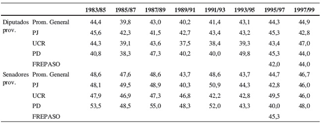 Si se distingue el reclutamiento por edades de diputados y senadores provinciales de acuerdo a los partidos políticos, se observan algunas características distintivas entre las agrupaciones. La Tabla 1 expresa el promedio de edad de diputados y senadores provinciales por partido político: