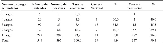 En segundo lugar, los datos agregativos exhiben la alta tasa de rotación del personal político que ingresó a la actividad, lo que ofrece indicios para estipular el tipo de profesionalización política que posibilitó la estabilidad democrática. A diferencia de un conjunto de casos provinciales, donde hay una mayoritaria presencia de grupos consolidados en el poder, como los de las provincias del norte del país (Behrend 2011), la alta rotación que muestra el caso analizado exhibe los obstáculos implícitos y explícitos para forjar una carrera política y aleja de pensar a los grupos en el poder como oligarquías enquistadas.