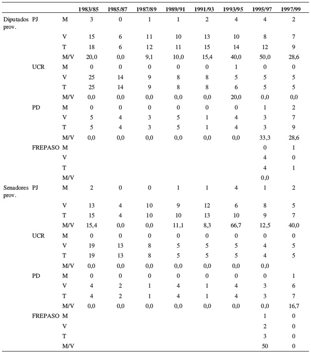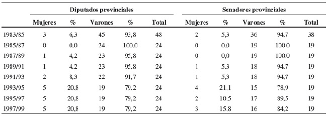 Una visión de conjunto similar surge del análisis de la composición por género de la Legislatura provincial y de los diputados y senadores nacionales enviados por Mendoza al Congreso nacional entre 1983 y 1999. La Tabla 3 exhibe la participación de las mujeres en las cámaras legislativas provinciales: