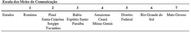 Apenas um estado - Mato Grosso - oferece por meio de todos os meios de comunicação aludidos acima, atingindo o score de 7 (sete), enquanto Rio Grande do Sul atingiu o nível 6 (não disponibiliza o atendimento presencial) (Quadro 1). O valor mínimo, de 1, acontece em Roraima, que disponibiliza somente o e-mail como forma de contato. O score que aparece com maior incidência é o 2, representado pelos estados Piauí, Santa Catarina, Sergipe e Tocantins, que oferecem somente o e-mail e o formulário da internet como formas de comunicação. O valor médio é de 3,43, a mediana é igual a 3 e o desvio-padrão é de 1,7.