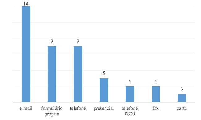 Para analisar a eficácia das Ouvidorias parlamentares como canais de comunicação, uma vez que elas são assim conceituadas pelas resoluções formais, cartilhas e manuais de funcionamento analisados, considera-se que um canal de comunicação só será usado se o cidadão souber que ele existe. Para um mecanismo como a Ouvidoria funcionar efetivamente é necessário divulgar a sua existência, seja nos próprios meios de comunicação institucionais, seja em oportunidades presenciais formais que reúnem representantes do Legislativo com os cidadãos. Em relação ao conjunto de formas de comunicação existentes nos Legislativos estaduais, as principais estão apresentadas no Gráfico 1.