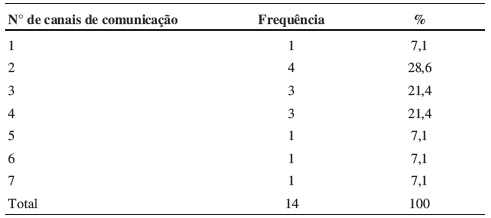 Das 14 Ouvidorias legislativas estudadas, percebe-se que a forma de contato predominante se concentra na internet (e-mail ou formulário próprio). A partir desses dados é possível pensar numa classificação das Ouvidorias pela capacidade de funcionarem como canais de comunicação. Se considerarmos que cada resposta positiva para um meio de comunicação recebe um score igual a 1, tem-se que, caso uma Assembleia utilize todos os meios de comunicação disponíveis, ela alcançaria uma pontuação igual a 7 (Tabela 1).