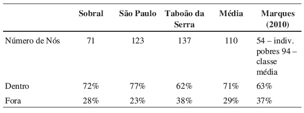 Comparando a média do número de contatos dos ACS com as pesquisas desenvolvidas por Marques (2010), percebemos que as redes dos ACS são maiores do que as das demais pessoas de baixa renda e, inclusive, das de classe média, o que pode ser explicado, justamente, como efeito da profissão e do próprio critério de seleção dos ACS (Tabela 1).