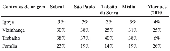 Analisamos também a origem dos vínculos dos ACS, ou seja, onde conheceram cada um de seus contatos. Os dados demonstram a proporção de contatos dos ACS que tiveram como origem aquele contexto, ou seja, qual o percentual de seus contatos que ele conheceu na igreja, vizinhança etc. Os resultados são demonstrados na Tabela 2.