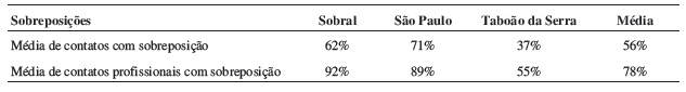 Outro elemento relacional importante é a sobreposição de vínculos que analisa quantos dos contatos dos ACS passam por mais de uma esfera de sociabilidade (como, por exemplo, trabalho e igreja, trabalho e vizinhança etc.). A análise da sobreposição é importante para essa política na medida em que uma de suas expectativas é aproximar a relação entre a política de saúde e usuários a partir da atuação dos ACS. A sobreposição permitiria, portanto, que os ACS tivessem vínculos mais próximos da população e, por conhecerem os usuários em diversas esferas de sociabilidade, fossem capazes de adaptar as políticas às realidades locais. Ou seja, na medida em que possuem mais de um tipo de vínculo, os ACS seriam capazes de transformar e adaptar as práticas e a linguagem, levar e trazer informações, realizar uma conexão entre o Estado e a sociedade não apenas em termos relacionais (conhecer as pessoas), mas também em termos dinâmicos (comunicar-se e trocar informações com essas pessoas). A Tabela 3 apresenta os resultados da análise da sobreposição.