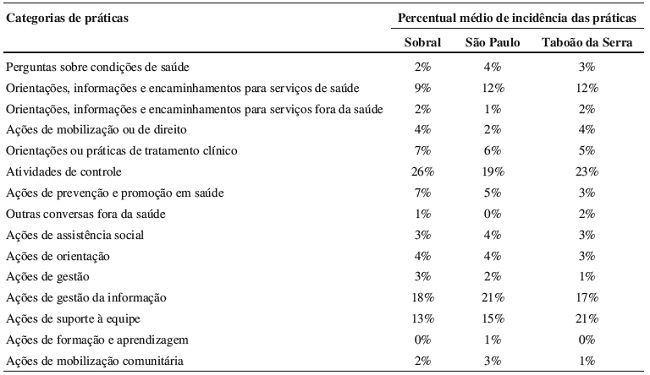 A análise das práticas se baseou em um minuncioso levantamento e categorização de todas as ações realizadas pelos ACS em sua rotina de trabalho. As atividades foram coletadas na etnografia e posteriormente sistematizadas para análise e comparação. Resultaram em 108 práticas diferentes organizadas em 15 categorias gerais apresentadas aqui.