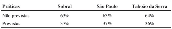Outra análise interessante diz respeito à previsibilidade, ou não, das atividades desenvolvidas pelos ACS. A questão analisada é o quanto as ações desenvolvidas pelos ACS em seu cotidiano estão previstas em leis, regulamentos, manuais ou documentos de formação. A Tabela 5 demonstra a média de incidência de ações previstas, ou não, para os ACS em cada um dos municípios.