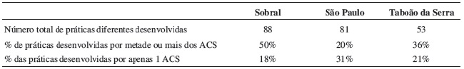 Analisando-se a Tabela 6, em primeiro lugar, salta aos olhos que em Sobral e São Paulo haja um número bem maior de atividades diferentes, se comparadas a Taboão da Serra. Isto sugere que nestas localidades os ACS realizam ações mais variadas e diferentes, o que pode ser explicado pelo fato de que em ambos os municípios os ACS estão há mais tempo em exercício e, por isso, têm mais liberdade e capacidade de realizar um número maior de práticas diferentes.